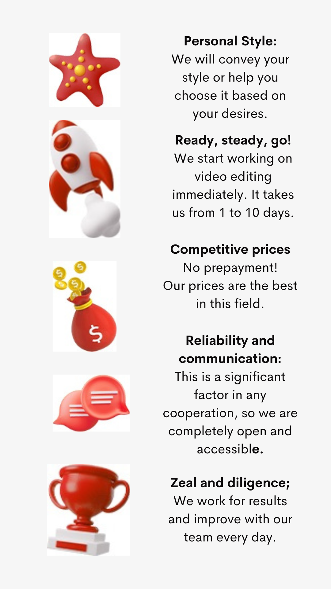 We discuss all possible issues and nuances concerning the work. We need to know: your montage example, deadlines, color correction style, additional materials, etc